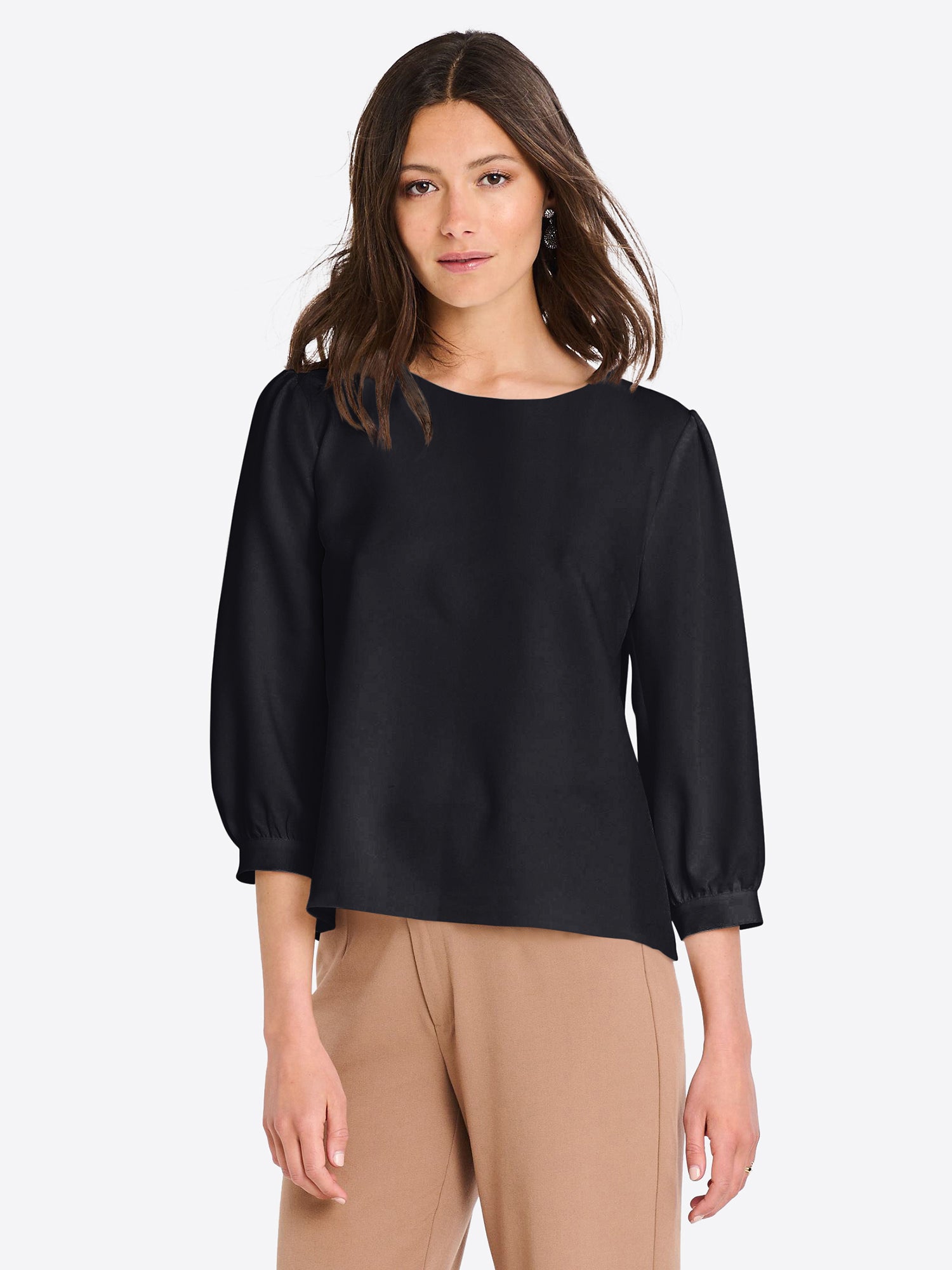 Blouse in soft recycled polyester from Jascha Stockholm. A-line model with three-quarter length light puff sleeves. The blouse has buttons at cuffs