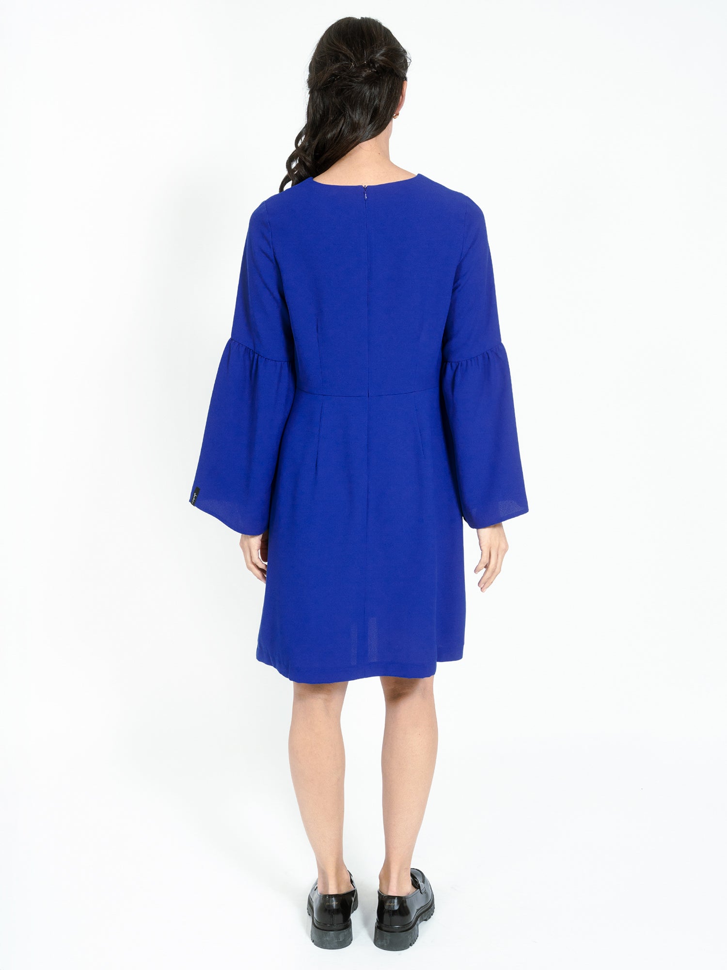 Knee-length dress in soft recycled polyester from Jascha Stockholm. Slightly slimmer model with a defined waist and long, wide trumpet sleeve. The dress has a hidden zipper at back.